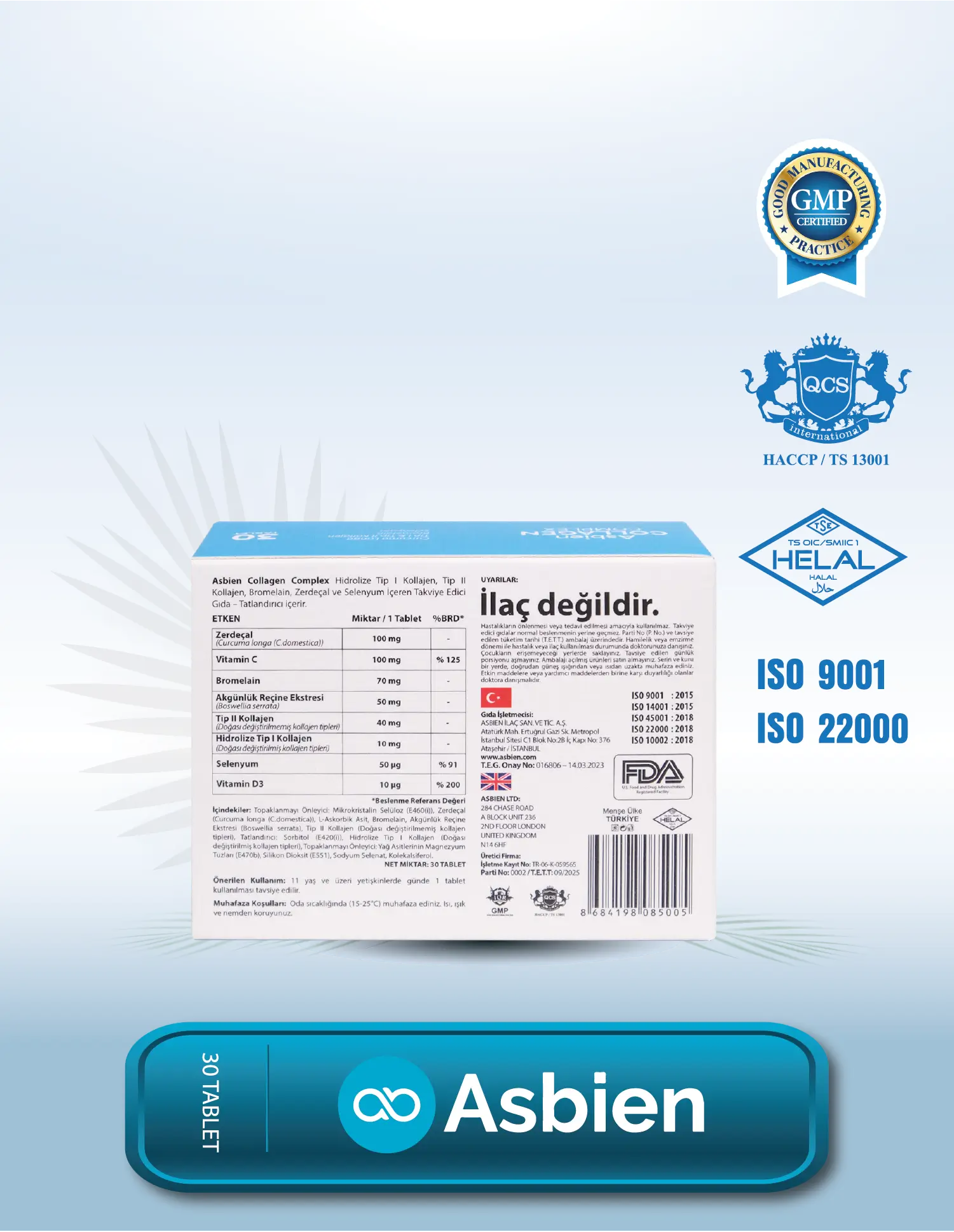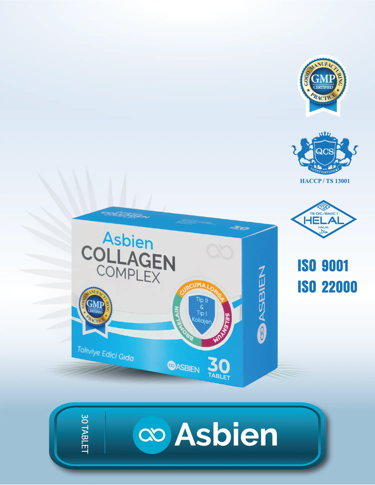 Asbien Collagen Complex, doğası değiştirilmemiş Tip 2 Kolajen, Hidrolize Tip 1 Kolajen, Zerdeçal ( Curcumin ), Bromelain, Selenyum, Akgünlük Reçine Ekstresi (Boswellia serrata), Vitamin C ve Vitamin D3 gibi özel bileşenler içeren bir takviye edici gıdadır.
